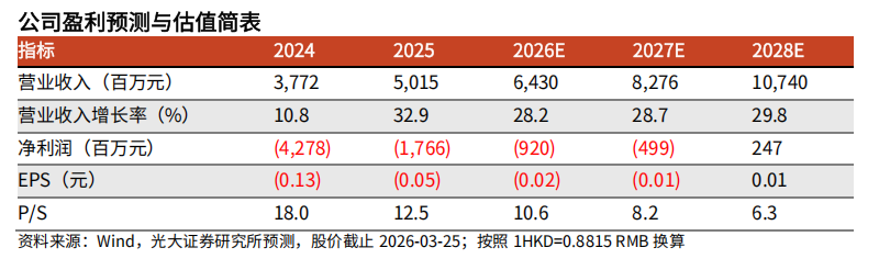 盈利预测、估值与评级:考虑到公司生成式AI业务持续高速增长,上调26-27年收入预测3%/5%至64.3/82.8亿元,新增28年收入预测107.4亿元; 综合考虑:1)管理组织效率优化;2)研发费用持续高投入率,调整26-27年净利润为-9.2/-5.0亿元(上次预测为-2.3/+1.7亿元),新增28年净利润预测2.5亿元。生成式AI打开中长期收入成长空间,维持“买入”评级。
