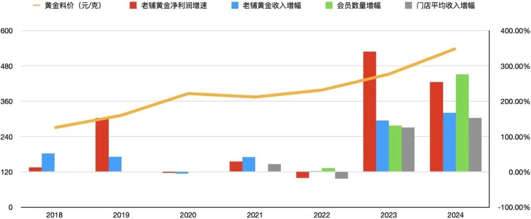 根据老铺黄金分别在A股、港股发布的招股书及2024年度财报测算对比,只有金价连续上涨期间,老铺的会员数量、门店平均收入会大幅增加。