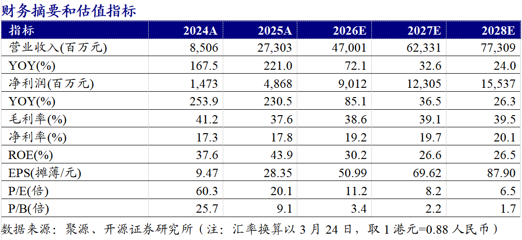 公司发布业绩公告:2025年营收273.03亿元(同比+221.0%,下同)、归母净利润48.68亿元(+230.5%),同时预计2026年一季度实现营收165-175亿元、归母净利润36-38亿元。考虑公司销售需求旺盛、渠道数量增长、品牌势能提升,我们上调2026-2027年并新增2028年盈利预测,预计2026-2028年归母净利润为90.12/123.05/155.37亿元(2026-2027年原值72.00/94.96亿元),对应EPS为50.99/69.62/87.90元,当前股价对应PE为11.2/8.2/6.5倍,维持“买入”评级。