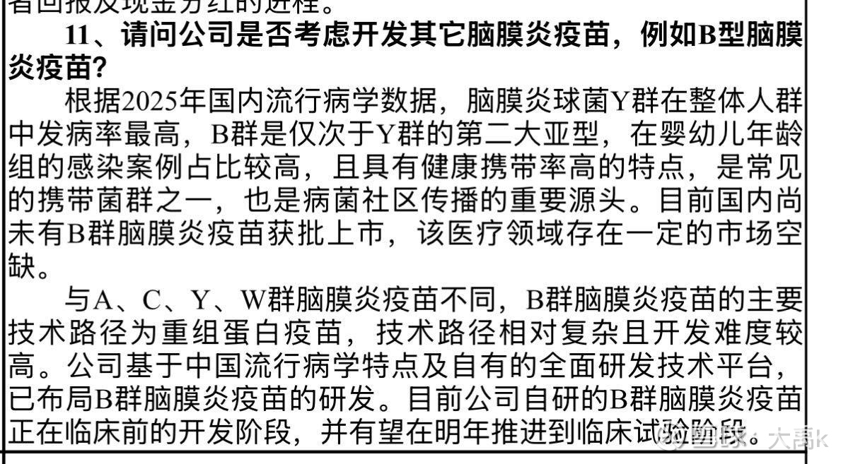 : 我们没有私下讨论吧?我说的是和其他朋友的讨论。要是纳入免疫规划,影响最大的是沃森。沃森目前主要收入是PCV13,然后我们对比沃森和港股康希诺的市值。冲击最大的沃森190亿市值,目前没怎么上量的康希诺市值不到100亿。所以对康希诺来讲,根本就不用考虑//