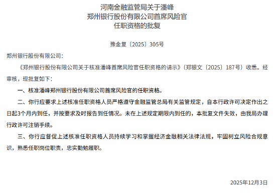 12月5日金融一线消息,河南金融监管局发布批复,核准潘峰郑州银行股份有限公司首席风险官的任职资格。
