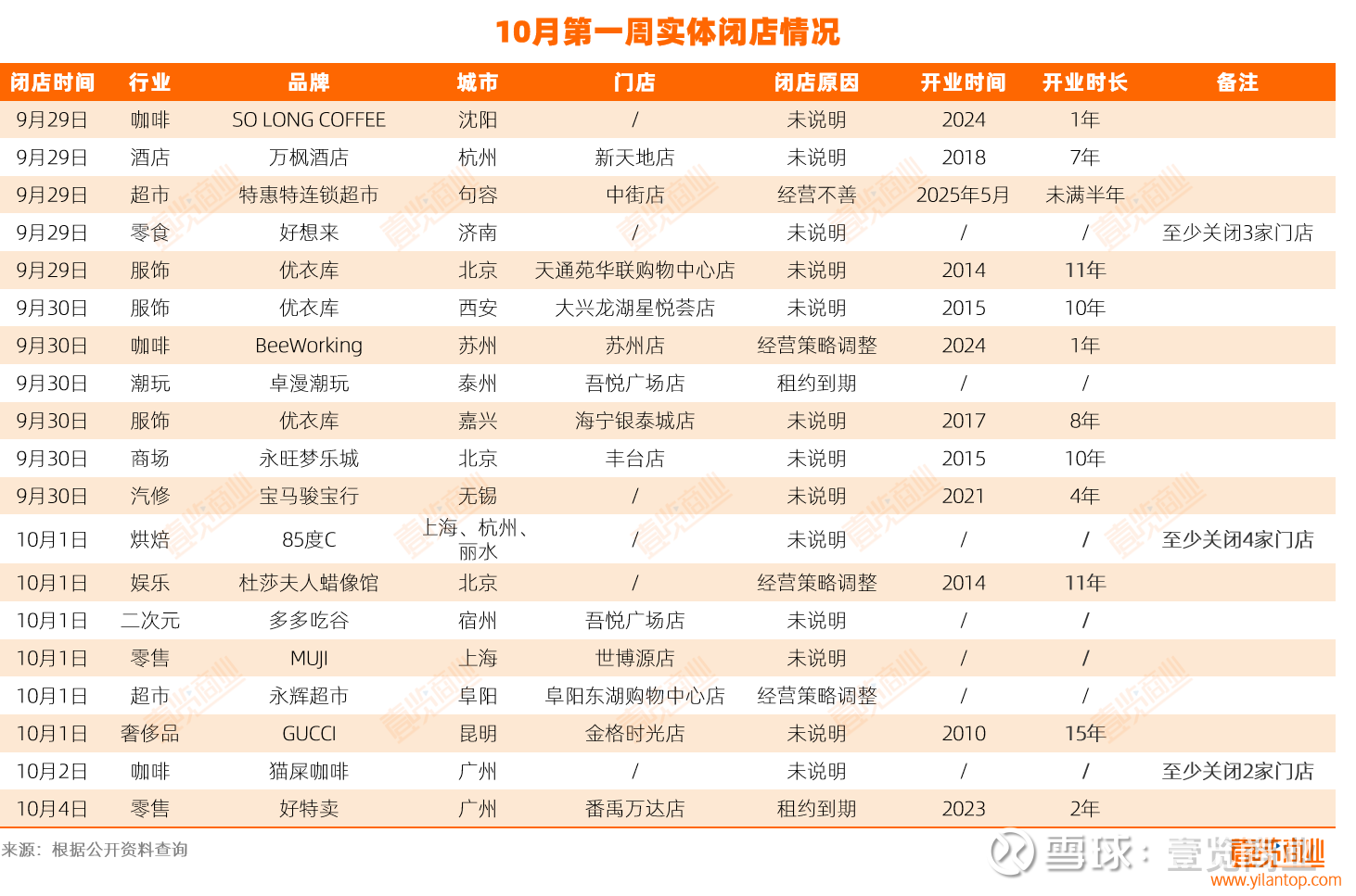 不完全统计,10月第一周,共17个品牌关闭了至少25家门店。
