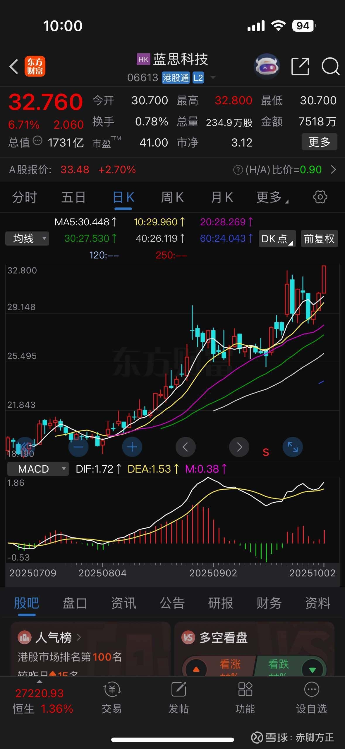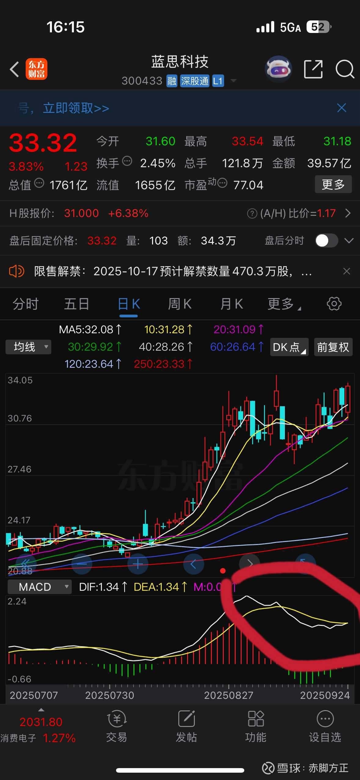 港股蓝思科技收盘后继续拉,A股蓝思科技自9月9号日线MACD死叉以后进入震荡修复阶段,随着果链加单+Openai合作传闻+T链机器人,今天终于再次金叉,意味着技术指标进入强势状态,接下来可以定心等待冲击历史高点的那一刻了。