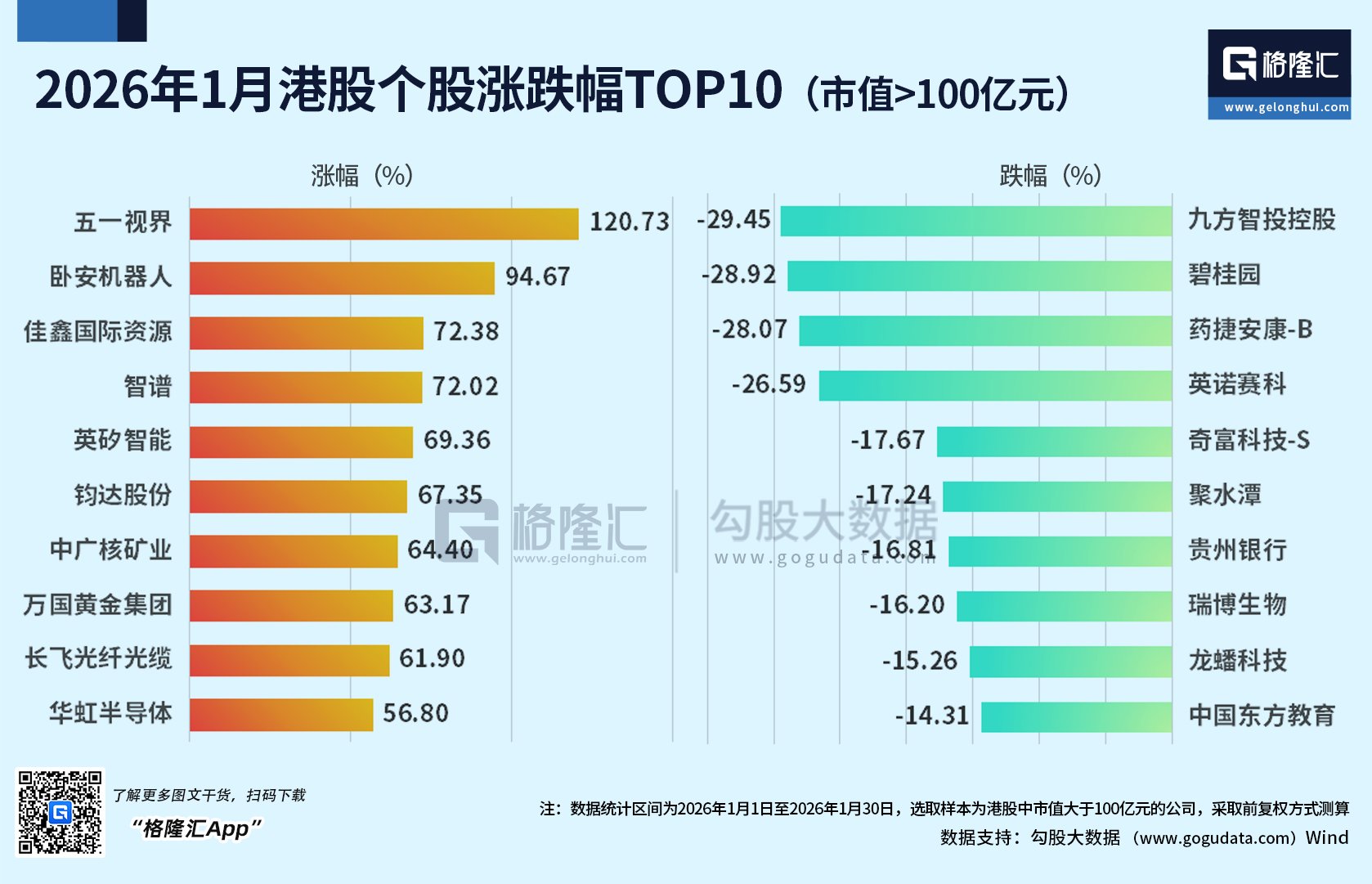 个股方面,1月涨幅前五的个股分别为:五一视界涨120.73%、卧安机器人涨94.67%、佳鑫国际资源涨72.38%、智谱涨72.02%、英矽智能涨69.36%;同期,跌幅前五的个股分别为:九方智投控股跌29.45%、碧桂园跌28.92%、药捷安康-B跌28.07%、英诺赛科跌26.59%、奇富科技-S跌17.67%。(格隆汇)