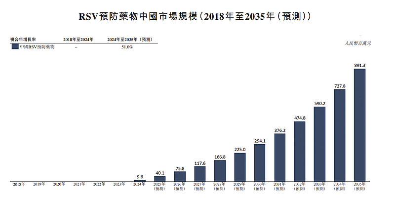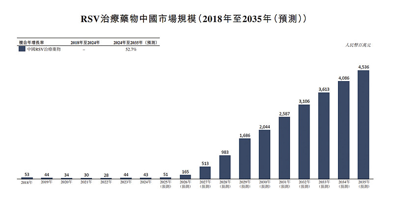 据灼识咨询报告数据,2024年全球RSV预防药物市场(不含RSV疫苗)规模约27亿美元,预计2035年将达到53亿美元,在中国市场,随着更多预防产品的预期上市,国内RSV预防药物市场预计自2025年起将逐步扩大。