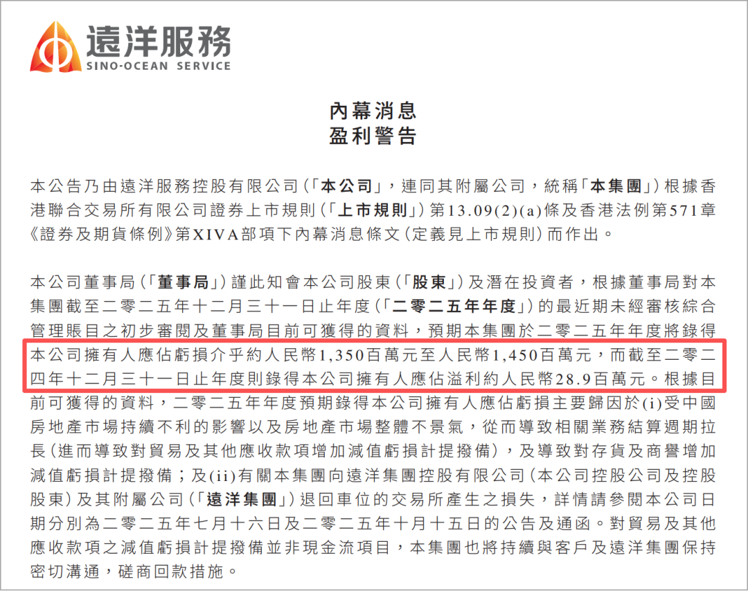 根据公告,远洋服务在2024年尚有2890万元的净利润,而2025年预计将巨亏超过13亿。这意味着,短短一年间,公司的盈利状况恶化了超过13亿元。