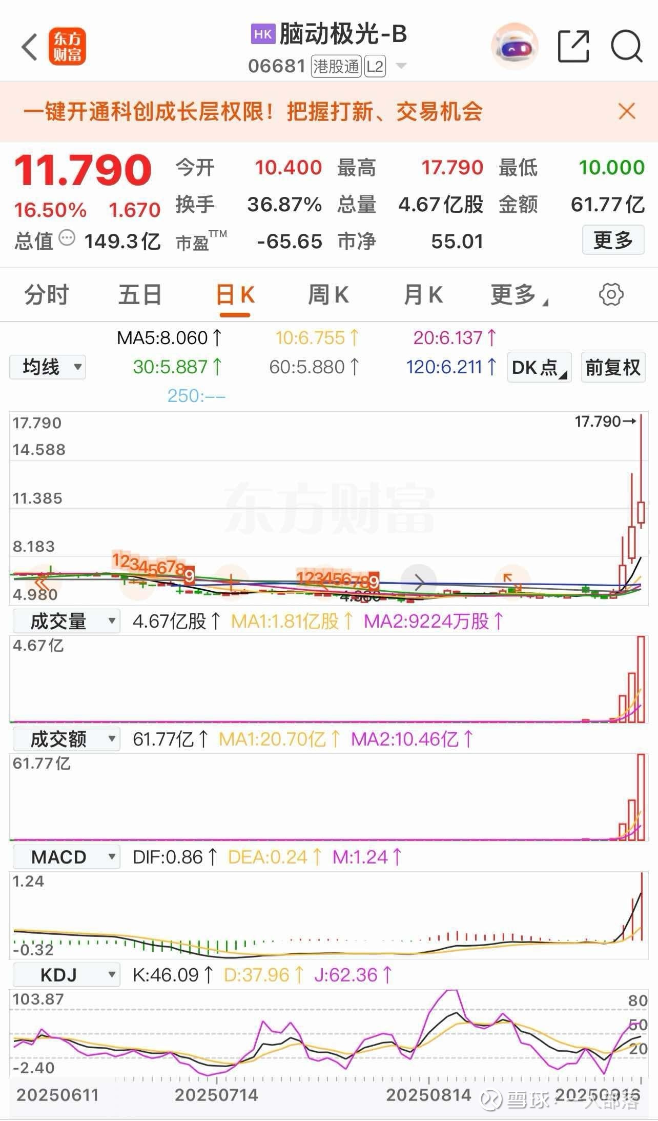 港股脑机接口概念股脑动极光-B一度拉升大涨超80%,报13.78港元,为连续第三日上涨,股价创上市新高,截至目前成交额放大至8亿港元。
