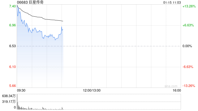 巨星传奇(06683)早盘涨超4%,早盘一度涨超13%。截至发稿,股价上涨3.83%,现报6.73港元,成交额2.76亿港元。