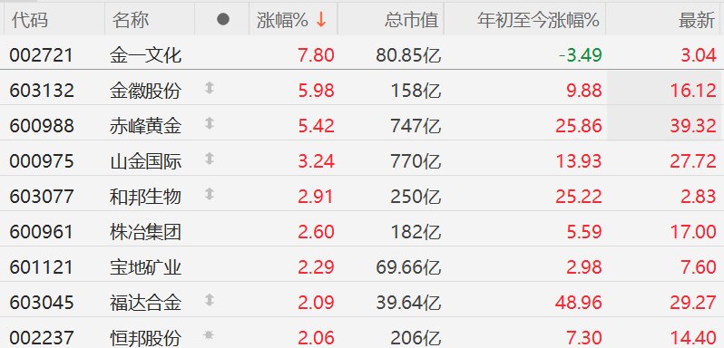 格隆汇3月27日|A股市场黄金概念股普涨,其中,金一文化涨近8%,金徽股份、赤峰黄金涨超5%,山金国际涨超3%,和邦生物、株冶集团、宝地矿业、福达合金、恒邦股份涨超2%。消息面上,现货黄金今日盘中短线拉升,涨1.39%报4439美元/盎司。