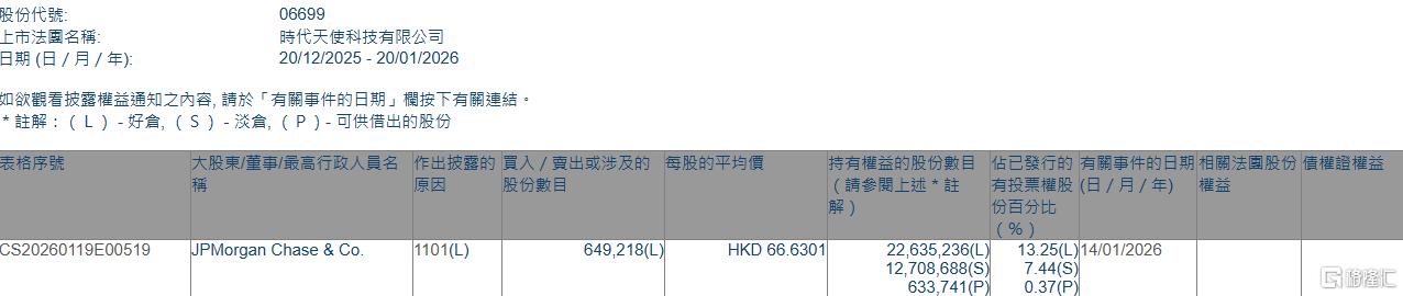 格隆汇1月20日丨根据联交所最新权益披露资料显示,2026年1月14日,时代天使(06699.HK)获JPMorgan Chase & Co.以每股均价66.6301港元增持好仓64.92万股,涉资约4325.75港元。