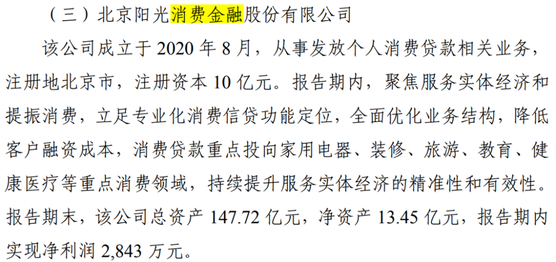 图片来源:光大银行财报公开资料显示,阳光消费金融成立于2020年8月,注册资本10亿元,股东方包括中国光大银行股份有限公司、中青旅控股股份有限公司、王道商业银行股份有限公司。