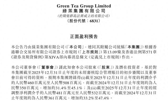 根据预告,绿茶集团预计2025年实现净利润约人民币4.60亿元-5.08亿元,较2024年的3.50亿元增长31.4%-45.1%。更为瞩目的是,剔除股份支付、上市开支等非经常性项目后的经调整净利润,预计达到4.81亿元-5.32亿元,同比增长33.2%-47.4%。