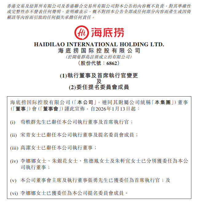 1月13日晚间,海底捞(06862.HK)在港交所公告,苟轶群已辞任公司执行董事及首席执行官,基于对公司管理层安排的整体调整及综合考察,董事会主席兼执行董事张勇已获委任为公司首席执行官,自2026年1月13日起生效。