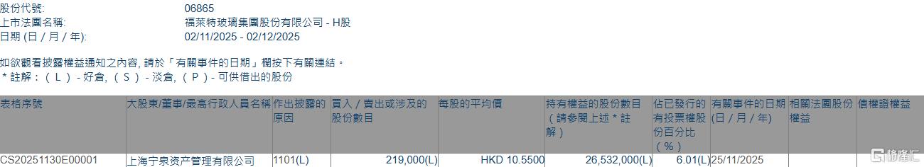 格隆汇12月2日丨根据联交所最新权益披露资料显示,2025年11月25日,福莱特玻璃(06865.HK)获上海宁泉资产管理有限公司在场内以每股均价10.55港元增持21.9万股,涉资约231.05万港元。