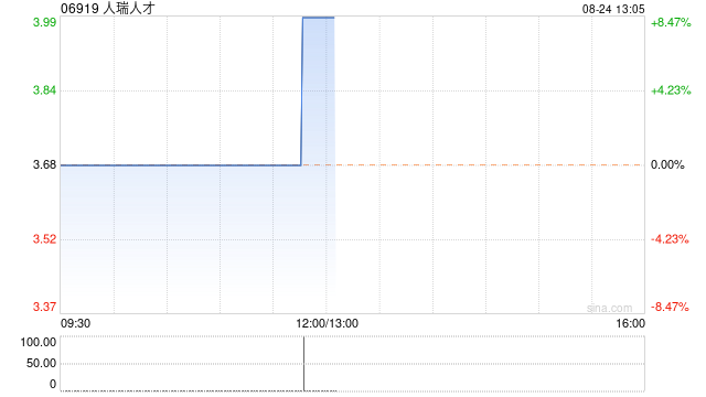 人瑞人才(06919)直线拉升上涨8.42%,现报3.99港元,港股市值6.25亿港元。