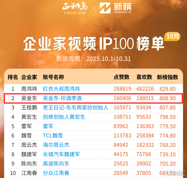 近日,正和岛联合新榜发布《企业家视频IP100榜单(10月)》,珍酒李渡集团董事长吴向东凭借个人视频号"吴金东—珍酒李渡"影响力登榜,位列第二。
