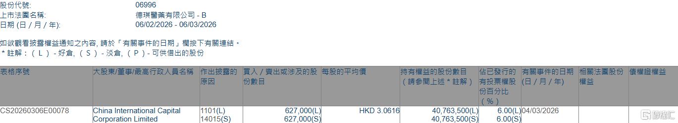 格隆汇3月6日丨根据联交所最新权益披露资料显示,2026年3月4日,德琪医药-B(06996.HK)获China International Capital Corporation Limited在场内以每股均价3.0616港元增持好仓62.7万股,涉资约192万港元。