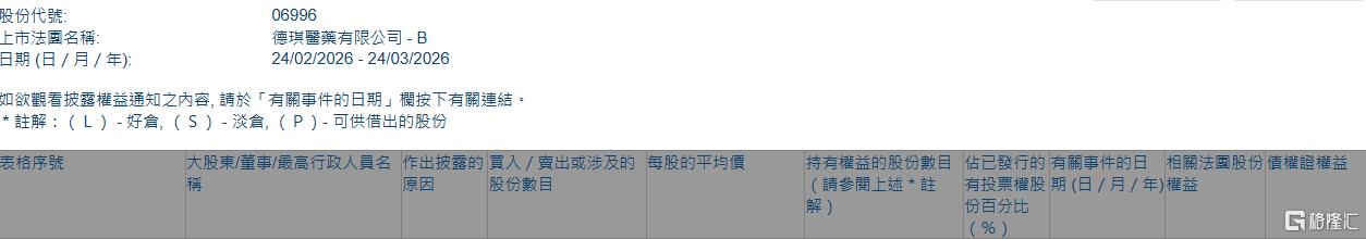 格隆汇3月24日丨根据联交所最新权益披露资料显示,2026年3月23日,德琪医药-B(06996.HK)获执行董事龙振国在场内以每股均价3.893港元增持26.75万股,涉资约104.14万港元。