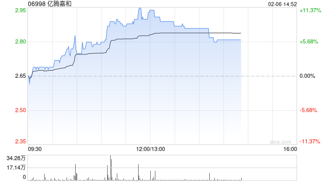 亿腾嘉和(06998)盘中一度涨超9%,截至发稿,股价上涨6.04%,报2.81港元,成交额980.47万港元。
