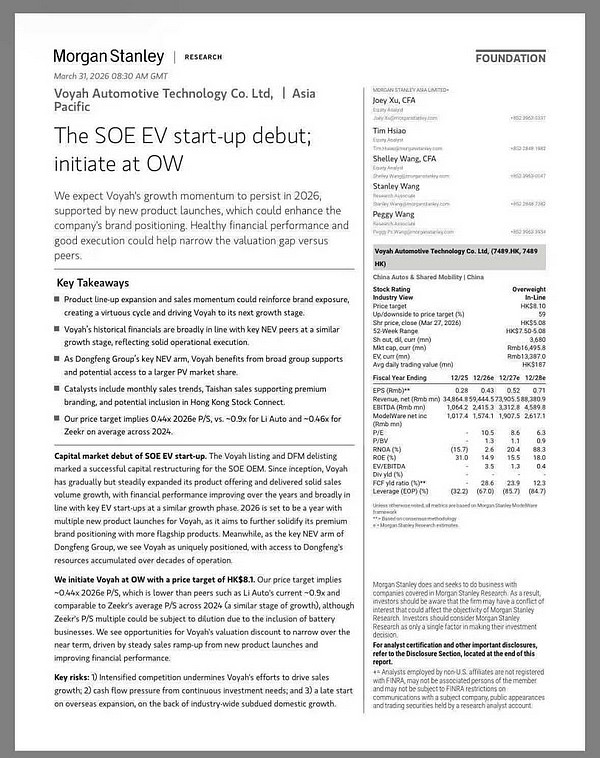 基于销量的稳定增长,岚图汽车完成上市不到半个月,机构便释放看多信号。摩根士丹利日前发布研报对岚图汽车给予增持评级,目标价8.10港元。