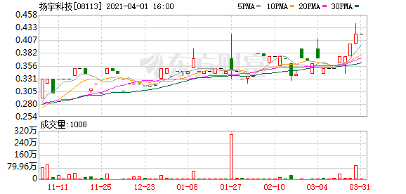 【财华社讯】港交所权益资料显示,扬宇科技(08113-HK)获主席兼执董严玉麟于3月30日在场内以每股平均价0.41港元增持92万股,涉资37.72万港元。增持后,严玉麟的最新持股数目为254,275,861股,持股比例由38.81%升至38.95%。