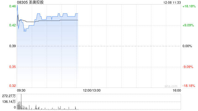圣唐控股(08305)午前涨超14%,近一周累计涨幅逾1.2倍。截至发稿,股价上涨14.29%,现报0.44港元,成交额1082.88万港元。