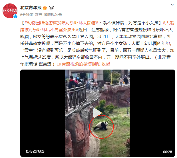近日,江苏盐城,网传有游客违规投喂可乐吓坏大熊猫,网友纷纷表示应永久禁止其入园。5月1日,大丰港动物园回应北青报,可乐并非故意投喂,而是不小心掉下去的。对方是个小女孩,大概上幼儿园的年纪。“震生”没有喝到可乐,是咬破后被气吓到了。目前,因五一假期人流量太大,加上气温超过25度,所以大熊猫全部收回室内,五一期间不再室外展出。