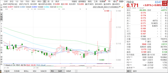 11月3日消息,刚刚F8企业放量成交1.92亿股,涉资3263万港元,市值只有1.7亿港元,过去日常成交只有几十万或100多万股,昨日公司股价异动暴涨66%,但成交额尚不足今日的1/3。