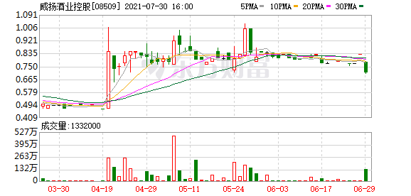 威扬酒业控股(08509.HK)发布公告,应公司要求,股份自2021年6月30日上午九时正起暂停于联交所买卖,以待刊发2021年经审核全年业绩。公司已向联交所申请股份自2021年8月2日上午九时正起于联交所恢复买卖。