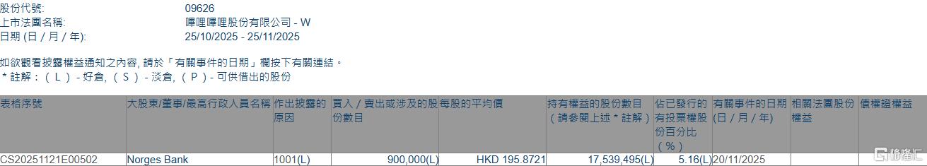 格隆汇11月25日丨根据联交所最新权益披露资料显示,2025年11月20日,哔哩哔哩-W(09626.HK)获Norges Bank在场内以每股均价195.8721港元增持90万股,涉资约1.76亿港元。