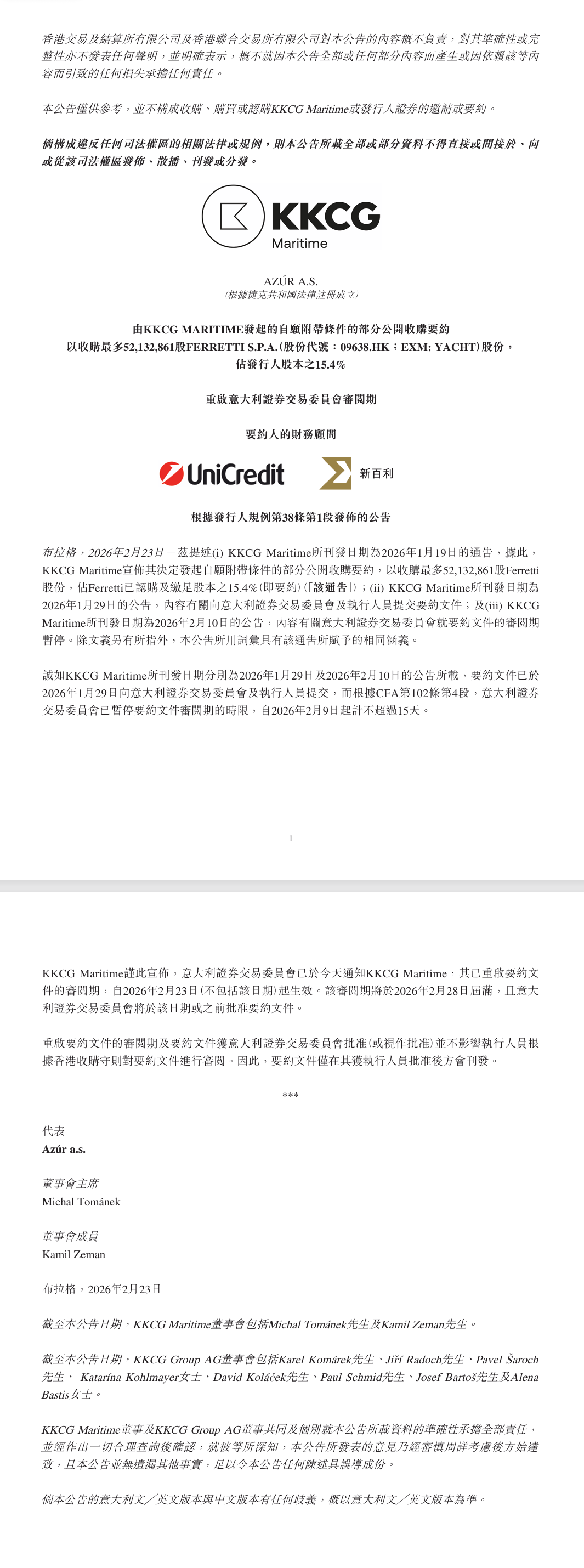 意大利游艇制造商法拉帝(Ferretti)股票收购的最新情况公告。