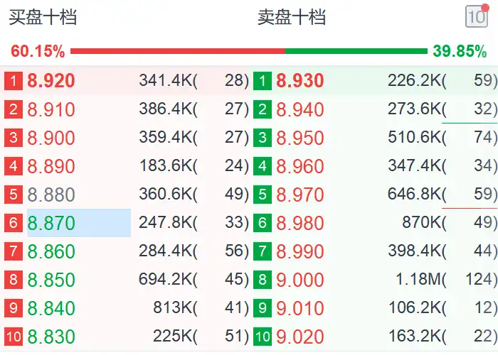 当前买卖盘数据呈现 “买力强劲、卖压有限”的格局,价格下行支撑坚实,上行虽有阻力但突破概率较高,短期大概率维持强势震荡或小幅上涨,若买盘持续发力,价格有望向9.0元及以上价位推进。