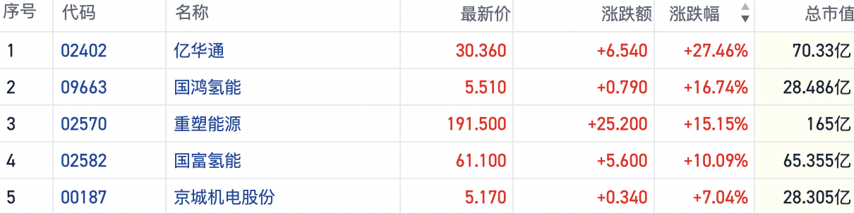 截至发稿,亿华通(02402.HK)涨超27%,国鸿氢能(09663.HK)、重塑能源(02570.HK)双双涨逾15%,国富氢能(02582.HK)跟涨超10%。
