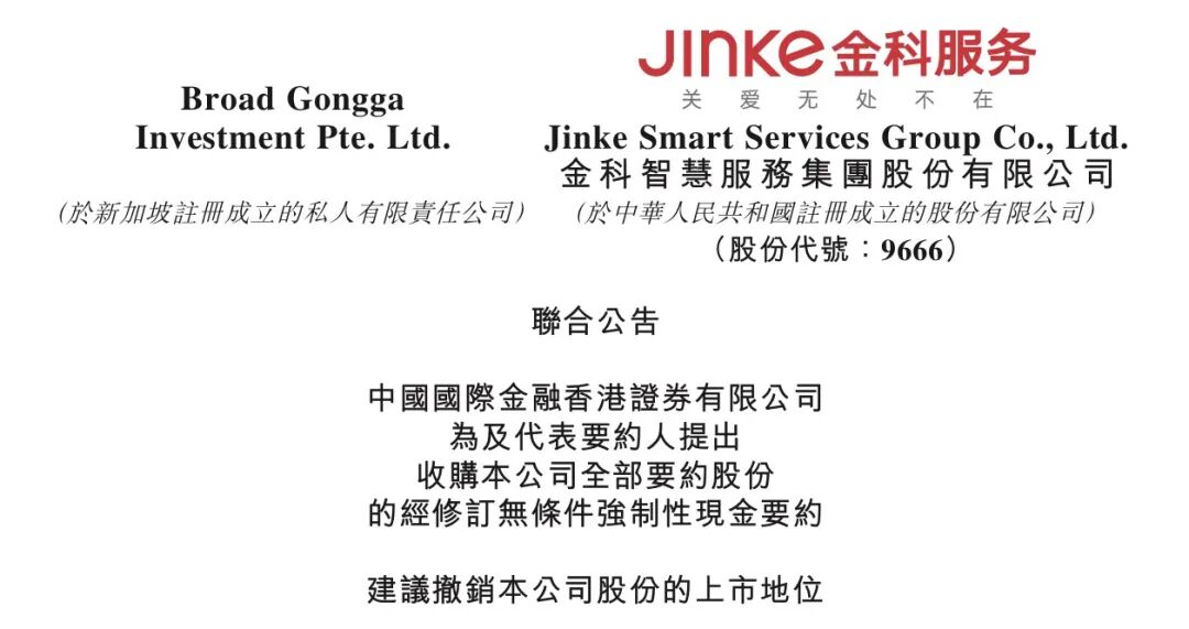 11月18日,金科服务与Broad Gongga Investment Pte.Ltd.(博裕资本)发布联合公告,宣布中国国际金融香港证券有限公司代表要约人提出收购金科服务全部要约股份的经修订无条件强制性现金要约,并建议撤销金科服务股份的上市地位及恢复买卖。