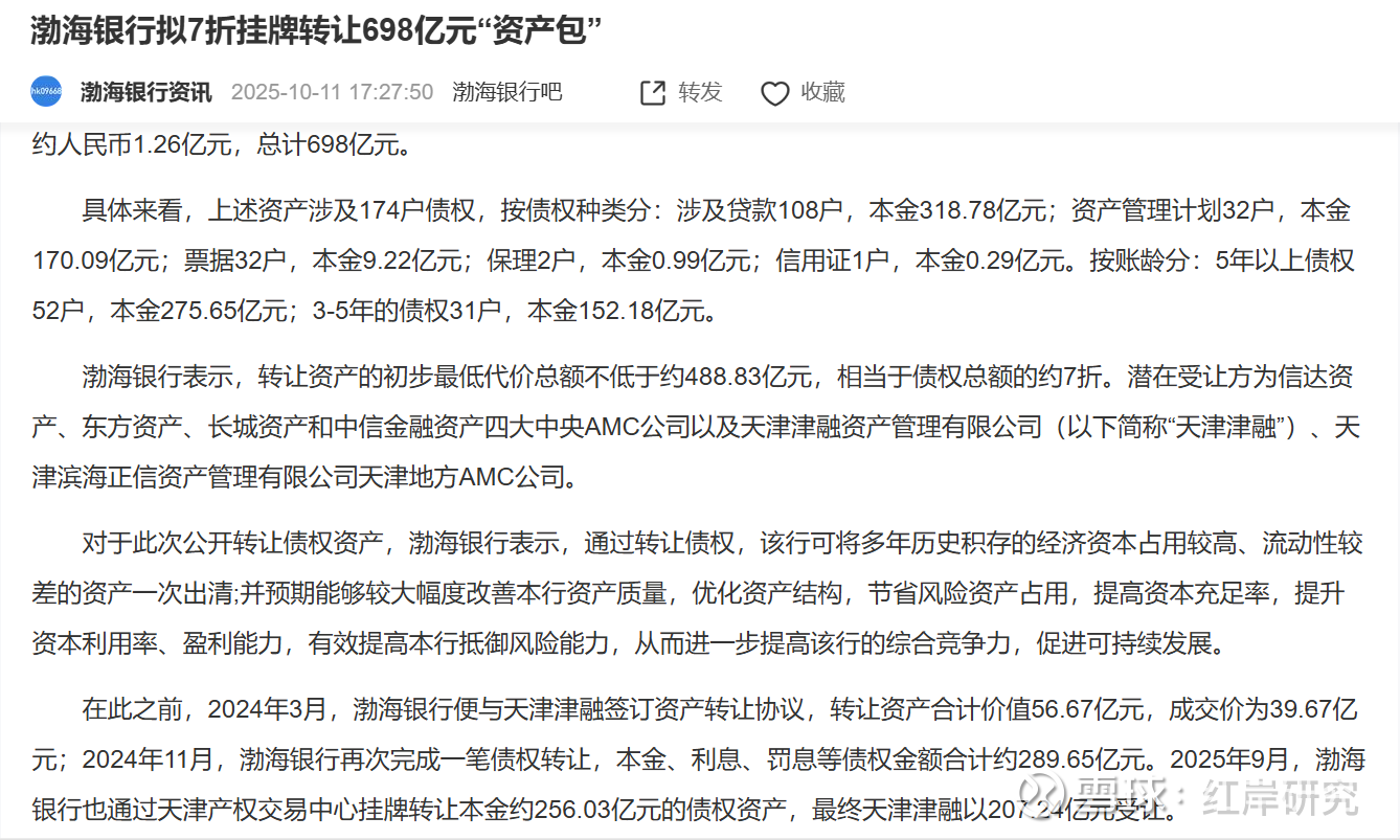 【渤海银行:拟公开挂牌转让约499.37亿元债权资产】