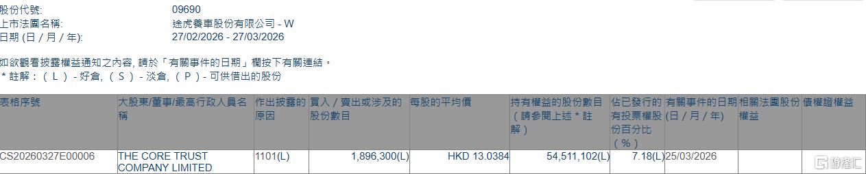 格隆汇3月27日丨根据联交所最新权益披露资料显示,2026年3月25日,途虎-W(09690.HK)获THE CORE TRUST COMPANY LIMITED在场内以每股均价13.0384港元增持189.63万股,涉资约2472.5万港元。