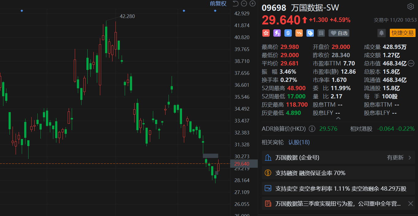 格隆汇11月20日|万国数据-SW(9698.HK)盘中一度涨近6%,该股近期走弱此前更是录得6连跌行情,现报29.64港元,总市值470.5亿港元。消息上,万国数据2025年第三季度的净收入同比增长10.2%,达到28.87亿元(人民币,下同);净利润7.29亿元,同比扭亏为盈;经调整EBITDA为13.42亿元,同比增长11.4%。公司维持2025年总收入指引112.9亿至115.9亿元;经调整EBITDA介乎51.9亿至53.9亿元。资本支出指引为27亿元。