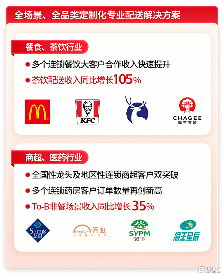 顺丰同城作为独立第三方即配平台,与各大行业头部KA客户合作市占率长期保持领先,例如瑞幸、麦当劳、肯德基、霸王茶姬、山姆、海王星辰……为这些品牌提供一站式、全渠道配送服务,同时成为平台高峰时期的的弹性支撑,最大化受益外卖大战。数据显示,上半年公司B端收入同比增长55%。此外,同期非餐场景也实现28.6%稳步增长,其中2B端同比增长35.3%。具体品类上来看,茶饮配送收入同比增长105%,商超、医药、母婴等品类均实现高双位数增长。