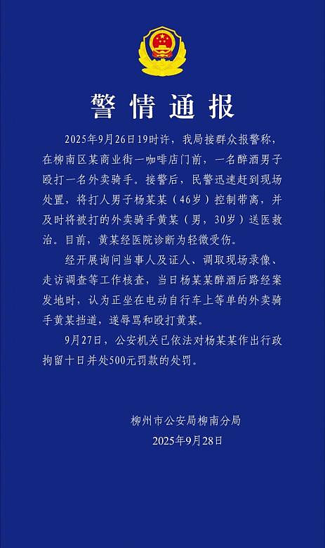 9月28日,广西柳州市公安局柳南分局发布警情通报:经开展询问当事人及证人、调取现场录像、走访调查等工作核查,当日杨某某醉酒后路经案发地时,认为正坐在电动自行车上等单的外卖骑手黄某挡道,遂辱骂和殴打黄某。9月27日,公安机关已依法对杨某某作出行政拘留十日并处500元罚款的处罚。