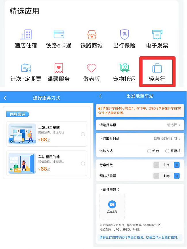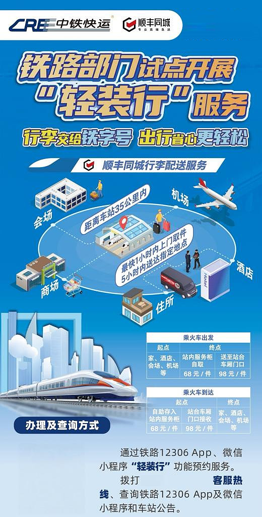 此次扩大试点范围,保持“轻装行”服务的预约方式、受理流程、价格标准等不变。旅客购买车票后可通过铁路12306App、微信小程序预约“轻装行”服务。
