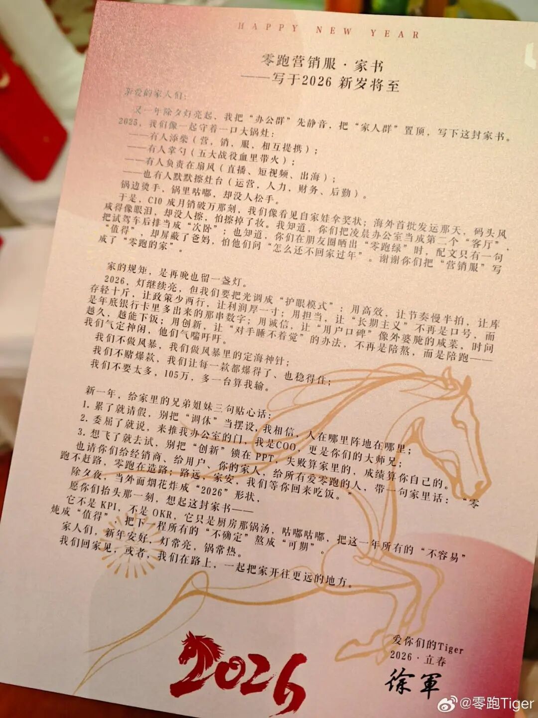 从其晒出的“写给零跑营销服的家书”内容中可以看到,徐军提到、2026 年要让灯继续亮,不过要把光调成“护眼模式”:用高效让节奏慢半拍,让库存轻 10 斤、让政策少两行、让利润厚一寸。同时,徐军还指出零跑“不做风暴”而是做风暴里的定海神针,“不赌爆款”而是让每一款爆得了也稳得住。