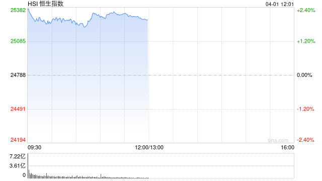 4月1日消息,港股三大指数集体上涨。截至午间收盘,恒生指数涨1.98%,报25277.74点,恒生科技指数涨1.59%,国企指数涨1.55%。盘面上,科网股涨多跌少,哔哩哔哩涨超5%,网易、百度涨超3%,阿里巴巴、腾讯、联想、快手涨超2%,美团跌超2%;创新药概念股大涨,荣昌生物涨超13%;航空股回暖,东方航空涨超6%;黄金股普涨,潼关黄金涨超10%。