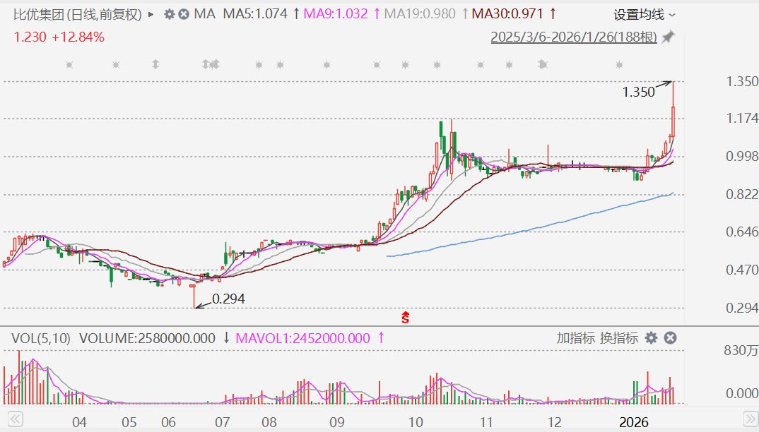 格隆汇1月26日|受益金银等贵金属价格不断新高,港股市场的“矿山”概念股比优集团(9893.HK)今日盘中一度涨近24%报1.35港元,股价创新高,市值升至48亿港元。