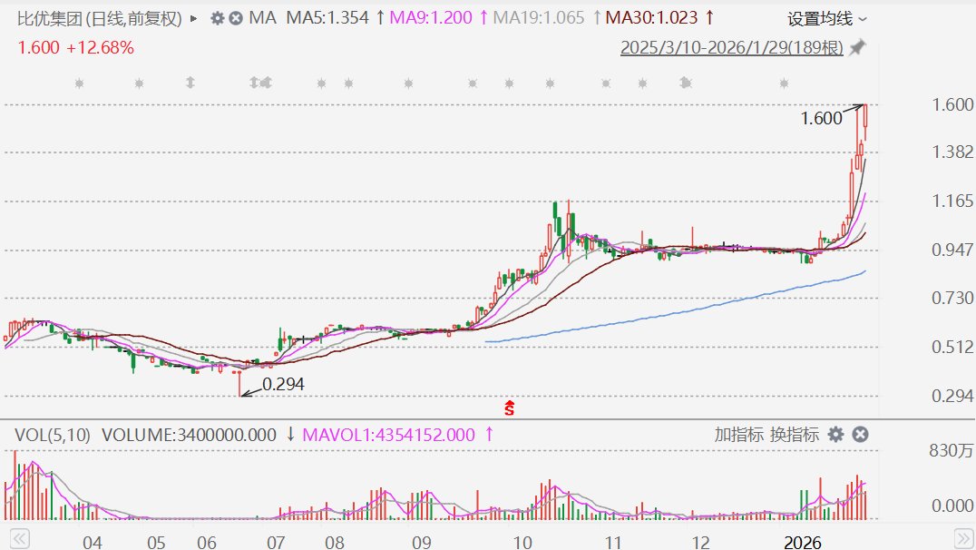 格隆汇1月29日|延续近期强势,港股市场的“矿山”概念股比优集团(9893.HK)今日盘中再度涨超12%至1.6港元,创历史新高,总市值超56亿港元。消息面上,现货黄金延续涨势,今日盘中一度冲高至5595.41美元/盎司,再创新纪录。现货黄金本周累涨超600美元,累涨幅度超12%。
