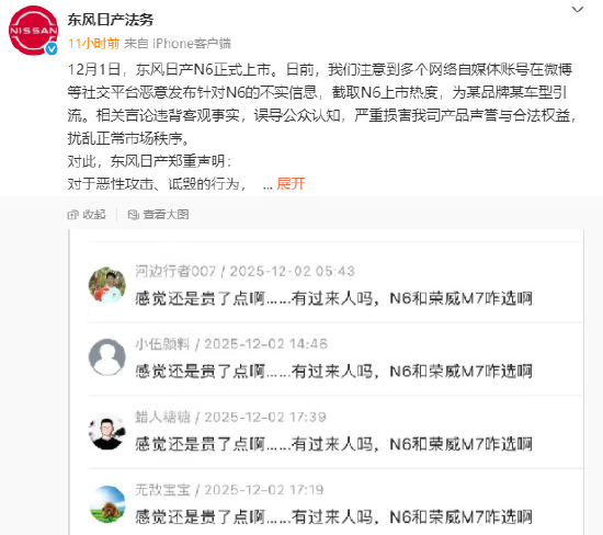 12月4日消息,东风日产法务昨晚在官微发布声明,称东风日产N6上市后,注意到多个网络自媒体账号在微博等社交平台恶意发布针对N6的不实信息,截取N6上市热度,为某品牌某车型引流。相关言论违背客观事实,误导公众认知,严重损害该公司产品声誉与合法权益,扰乱正常市场秩序。