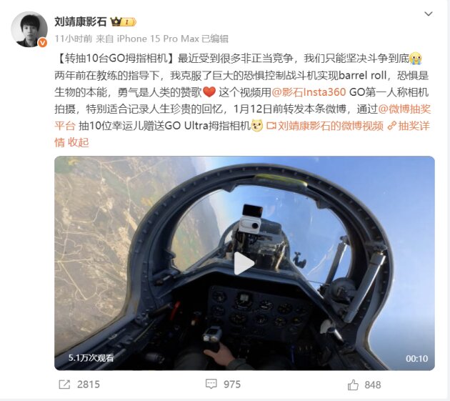 2025年12月13日凌晨,影石创新创始人刘靖康以“最近受到很多非正当竞争,我们只能坚决斗争到底”开篇,旋即笔锋一转,嵌入一段两年前“克服巨大恐惧操控战斗机完成barrel roll”的个人勇者故事,最终落点明确地导向产品拍摄优势与抽奖引流,情绪控诉、英雄叙事与商业推广在此完成了一次令人玩味的“三位一体”缝合。