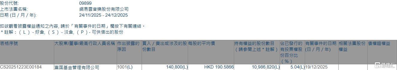 格隆汇12月24日丨根据联交所最新权益披露资料显示,2025年12月19日,网易云音乐(09899.HK)获富国基金管理有限公司在场内以每股均价190.5866港元增持14.08万股,涉资约2683.5万港元。