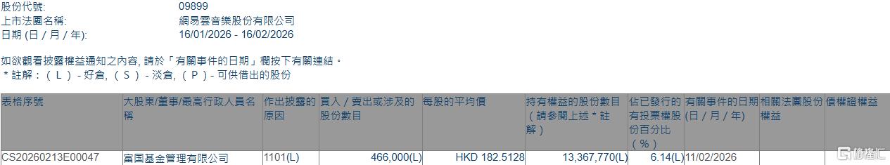 格隆汇2月16日丨根据联交所最新权益披露资料显示,2026年2月11日,网易云音乐(09899.HK)获富国基金管理有限公司在场内以每股均价182.5128港元增持46.6万股,涉资约8505.1万港元。