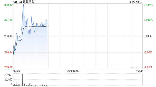 天数智芯(09903)早盘一度涨超7%,盘中高见310.60港元,股价创上市新高。截至发稿,股价上涨3.50%,报296港元,成交额1.81亿港元。