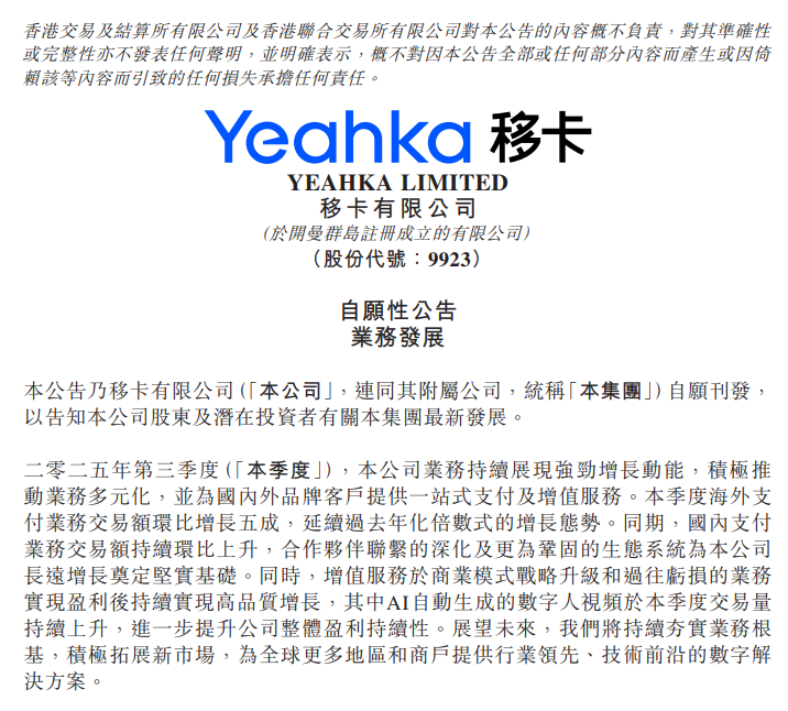 2025年Q3,本公司业务持续展现强劲增长动能,积极推动业务多元化,并为国内外品牌客户提供一站式支付及增值服务。